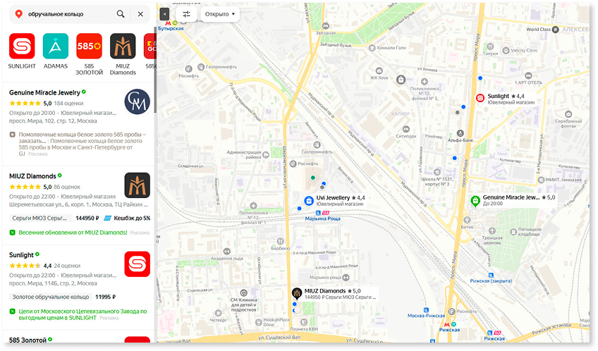 Задача: Продвижение карточки компании на Яндекс.Картах по ключевым запросам: "помолвочное кольцо", "обручальное кольцо", "кольцо для предложения".