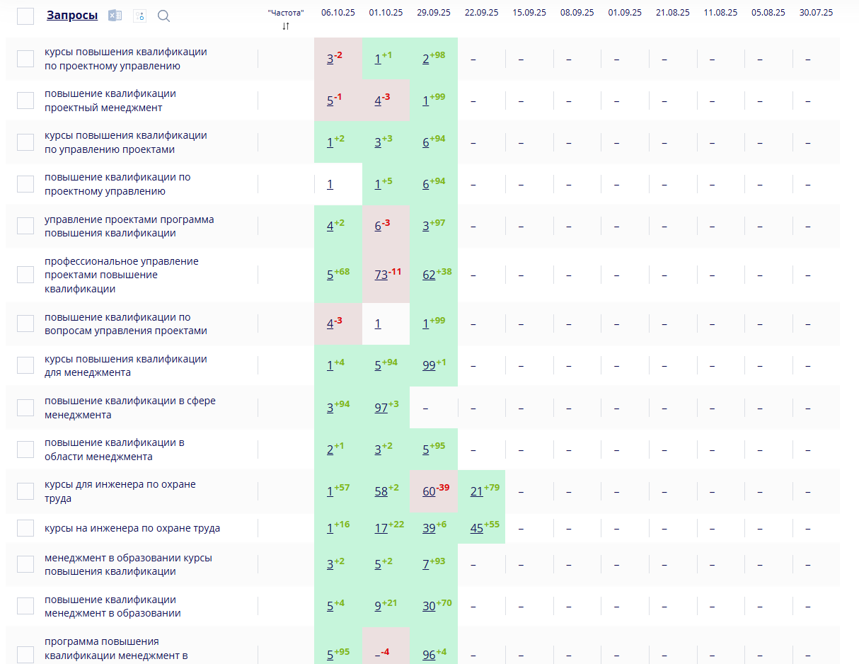 - Перекластеризировали семантическое ядро — выделили ключевые направления: повышение квалификации, курсы по ЖКХ, охране труда, машинисты кранов;