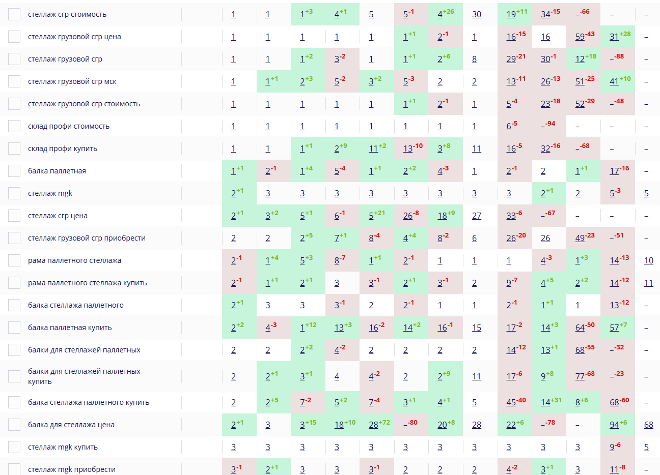 - Нулевая видимость в Яндексе по ключевым запросам («паллетный стеллаж купить», «стеллаж СГ Ультра цена», «балка паллетная»);