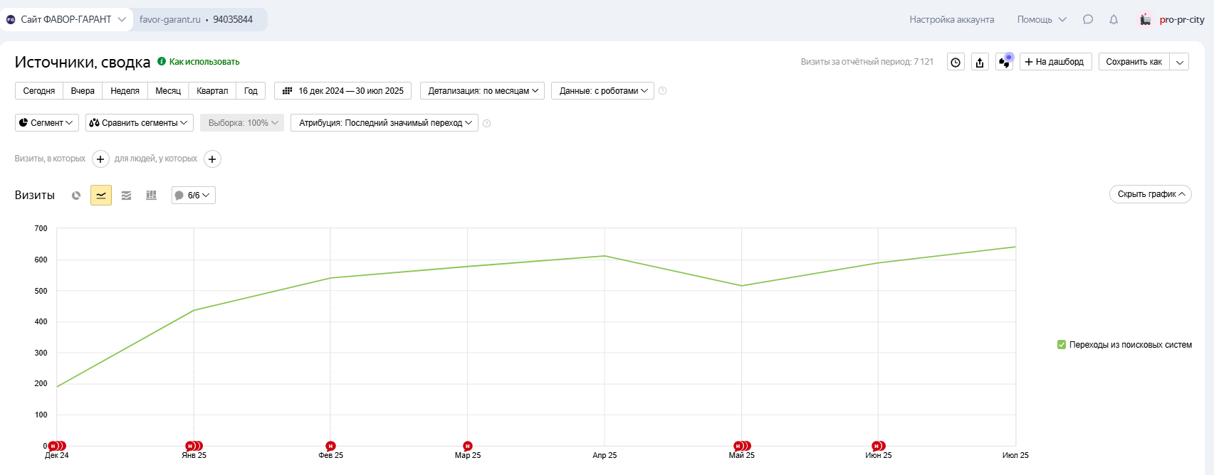 За 6 месяцев мы не просто «подкрутили» сайт, а создали фундамент для долгосрочного роста. Результат превзошёл ожидания клиента: вместо 198 визитов мы получили почти 700 целевых посетителей, которые превращаются в заявки на дизайн-проекты и изготовление.