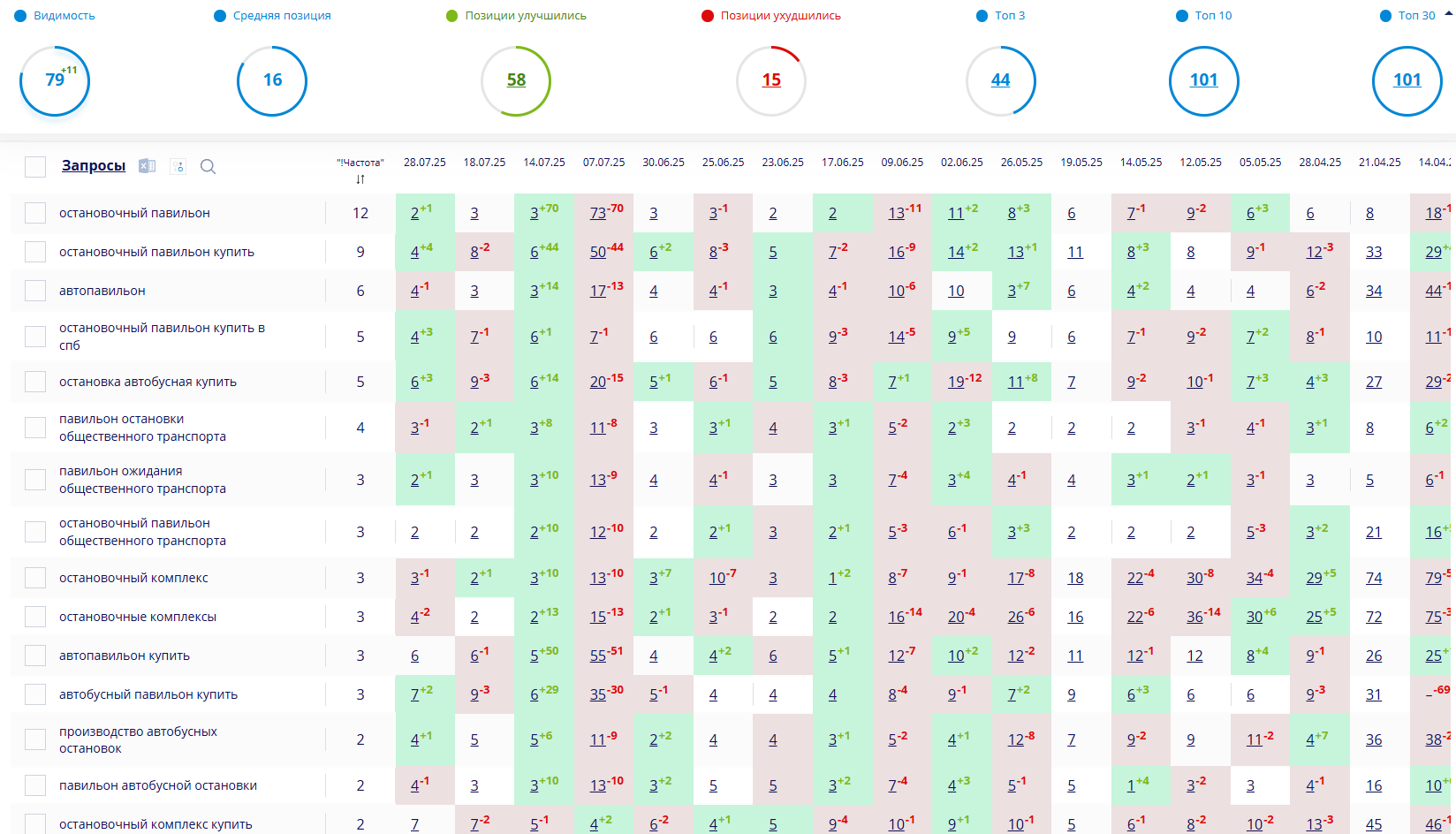 - Проводили еженедельный анализ позиций по ключевым запросам.