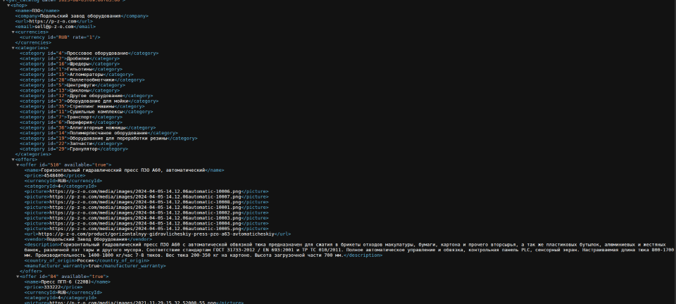 - Характеристики: Каждый товар содержит подробные технические параметры, что требует динамической генерации XML.